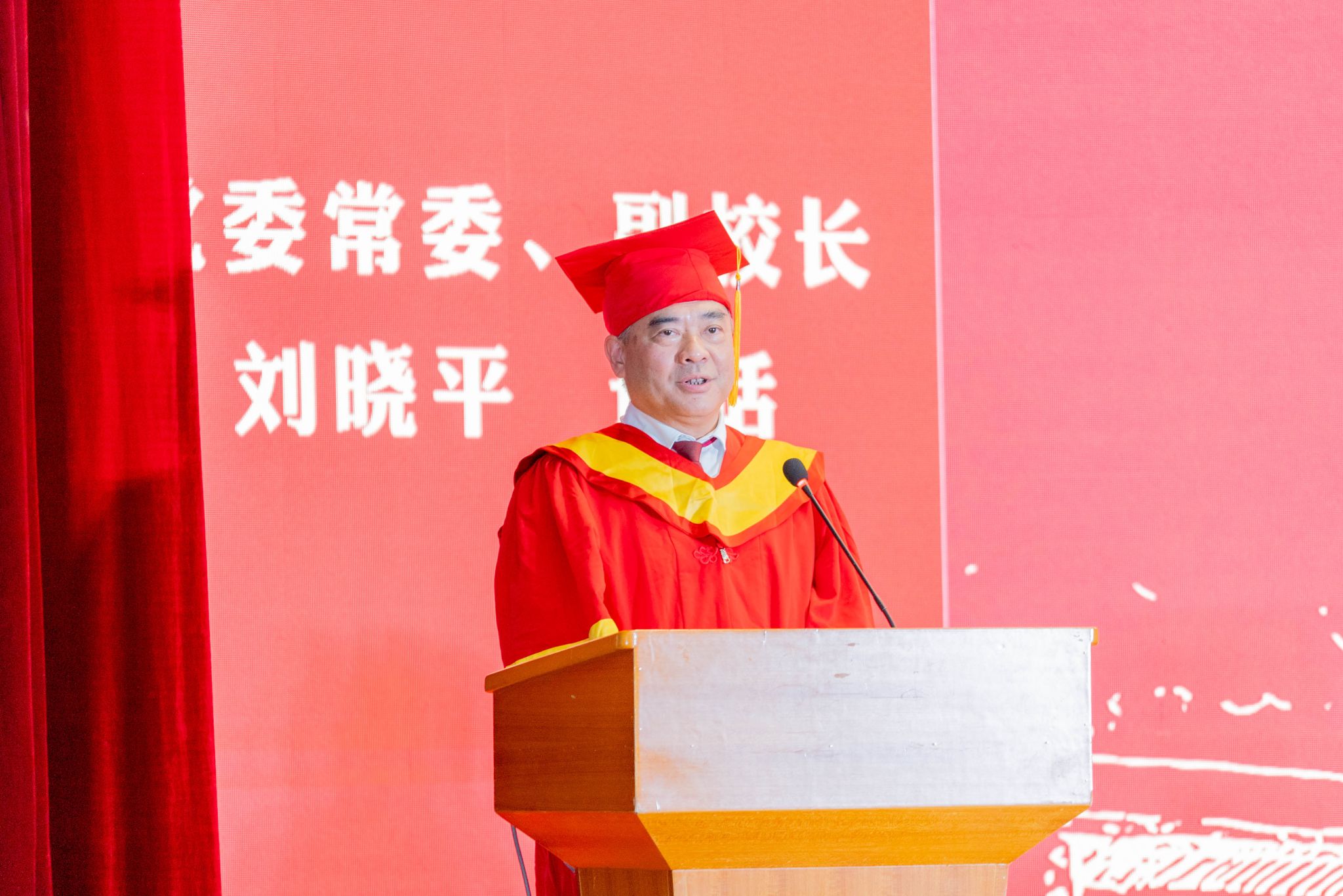 校党委常委、副校长刘晓平在讲话中代表学校向全体毕业生同学表示最热烈的祝贺,向所有奋战在立德树人岗位上的老师表示崇高的敬意,向始终关心和支持学校发展的家长、校友以及社会各界朋友表示衷心的感谢,他希望同学们要以“时不我待”的崇高使命,脚踏实地、久久为功;以“我将无我”的历史担当,坚定信仰、砥砺奋进;以“不负人民”的家国情怀,求是创新、逐梦星光。刘晓平表示,大家无论站得多高、走得多远,母校永远是你们温暖的港湾和精神的家园,祝同学们毕业快乐、前程似锦、梦想成真!