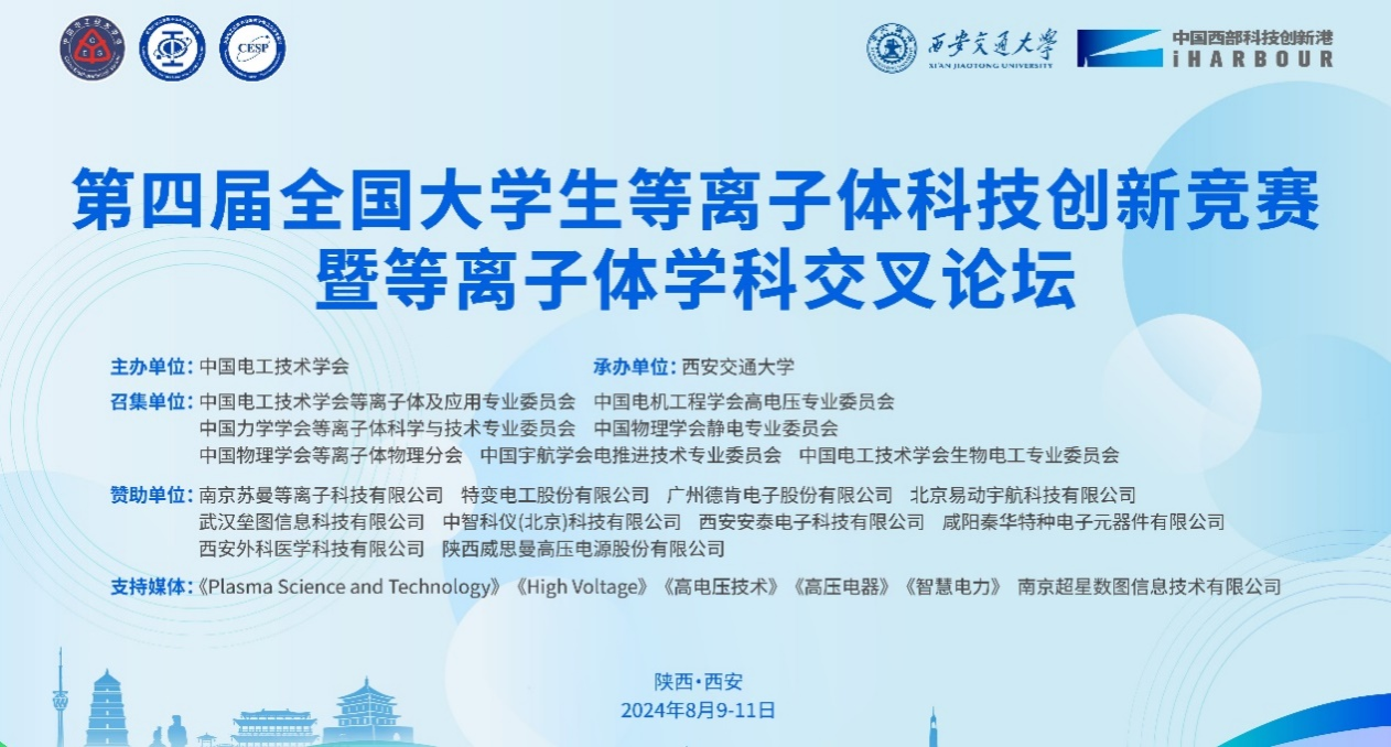 2024年8月9日-11日,第四届全国大学生等离子体科技创新竞赛决赛在陕西省西安市中国西部创新港顺利举行。本届竞赛由中国电工技术学会主办,西安交通大学承办,召集单位包括中国电工技术学会等离子体及应用专委会、中国电机工程学会高电压专委会、中国力学学会等离子体科学与技术专委会、中国物理学会静电专委会、中国物理学会等离子体物理分会、中国宇航学会电推进技术专委会、中国电工技术学会生物电工专委会。