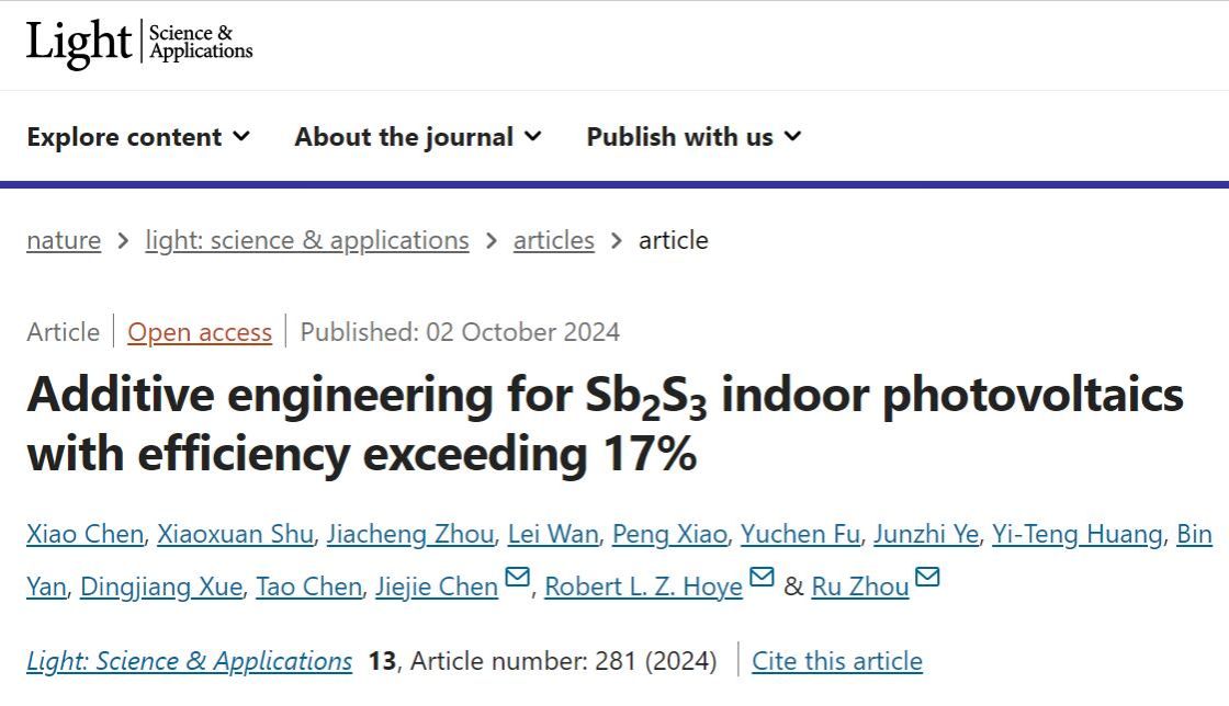 近日,我校必赢线路检测3003no1周儒课题组在先进室内光伏技术领域取得最新进展,相关研究成果以“Additive engineering for Sb2S3indoor photovoltaics with efficiency exceeding 17%”为题在线发表于Nature合作期刊《Light: Science & Applications》,该刊为光学领域国际顶级学术期刊。