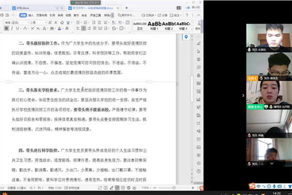 学生党员詹涪至会后表示,在此非常时期,通过此次视频会议,能够看到学校的老师、看到同学们,他感到非常温暖,知道不是自己一个人在战斗。他相信,学校、学院、老师、同学的心都在一起,共同等待春天的到来。