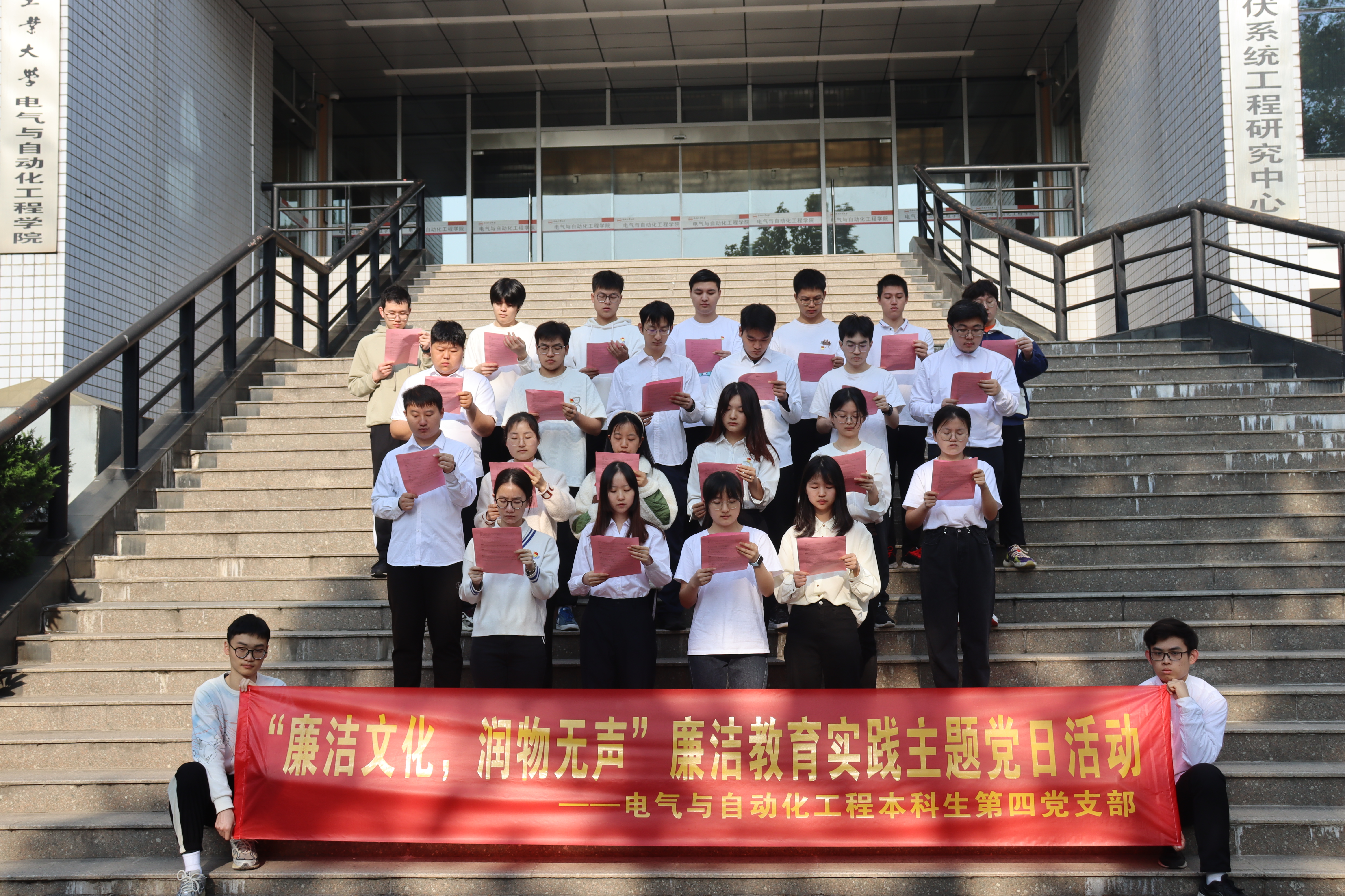 4月26日清晨,必赢线路检测3003no1本科生第四党支部全体党员在逸夫楼前开展“廉洁文化,润物无声”廉洁教育实践主题党日活动。