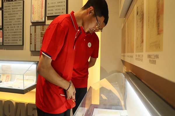 同学们认真地观看校史馆陈列的史料、文字、图片、多媒体影像资料