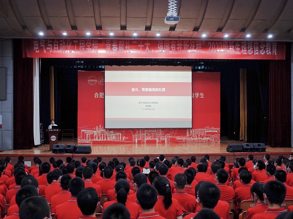学院党委相关负责人以《奋斗,青春最高的礼赞》为题,以习近平总书记给中国航天科技集团空间站建造青年团队的回信为开篇,从透视青年大学生不愿奋斗的表象、探寻矢志奋斗的意义和揭秘不懈奋斗的“密码”三方面展开叙述,为新生带来一堂严肃又不失风趣的理想信念教育课。运用典型生动的真实案例讲解青年学生中不愿奋斗的五大表现,通过讲述专业领域杰出校友、优秀朋辈榜样先进事迹,号召新生向杰出校友看齐,向朋辈榜样靠拢,志存高远,实干笃行,秉承工业报国之志,将个人命运与国家强盛、民族复兴紧紧联系在一起;回望《觉醒年代》《长津湖》《功勋》等党史题材主旋律作品内容,激发学生爱党爱国爱社会主义情怀,树立与这个时代主题同心同向的理想信念,担当起时代赋予的历史责任;通过“晚舟归国”“军团誓师”“鸿蒙上线”三个故事,倡导新生铸牢坚理想信念,锤炼过硬本领,保持忧患意识。最后,聚焦北京大学原校长王恩哥寄语新生的十句话,希望全体新同学“求真知、入主流、上平台、做贡献”,怀青衿之志,踔厉奋发、笃行不怠,跑好人生第二棒,把青春融入党和人民的事业之中,以奋斗姿态与伟大时代“双向奔赴”,争做堪当民族复兴重任的时代新人。