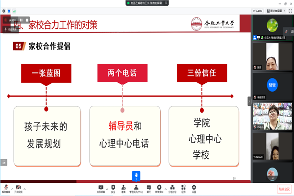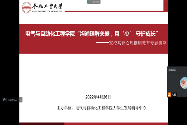 为向学生家长普及大学生心理健康知识,进一步发挥家校协同育人作用,4月26日晚,必赢线路检测3003no1通过腾讯会议平台举办“沟通理解关爱,用‘心’守护成长”家校共育心理讲座。活动邀请学校心理健康教育与咨询中心骆贵老师主讲,2021级200余位学生家长参与活动。