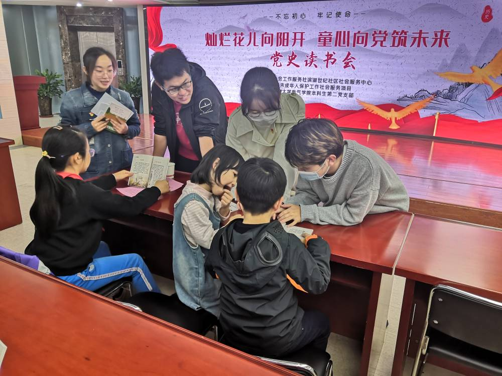 正值中国共产党建党百年之际,为进一步贯彻落实好党史学习教育任务,努力做到学史明理、学史增信、学史崇德、学史力行,10月22日下午,必赢线路检测3003no1本科生第二党支部赴滨湖世纪社区服务中心开展“灿烂花儿向阳开,童心向党筑未来”读书会主题党日活动,以学党史,悟思想为核心,与小朋友们一道学习党的历史故事。