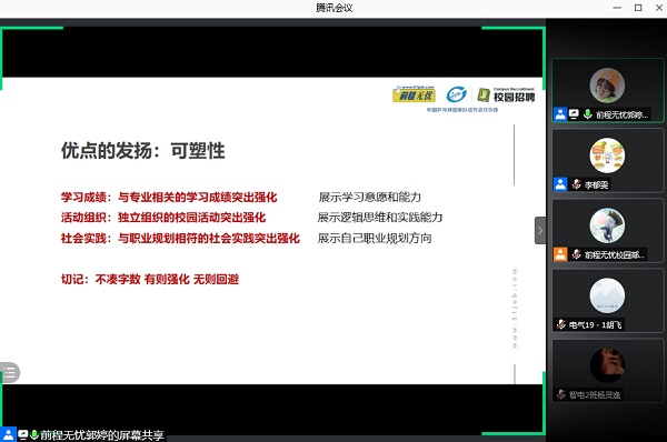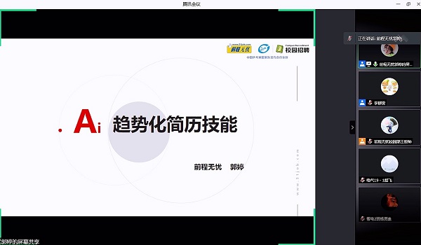 为提升学生的就业竞争力及简历制作能力,5月21日晚,必赢线路检测3003no1举行“AI趋势化简历技能”线上讲座。活动邀请了前程无忧校园部经理王恒帅全程在线互动,前程无忧校园招聘部项目执行经理郭婷老师担任主讲,百余名同学参加在线培训。