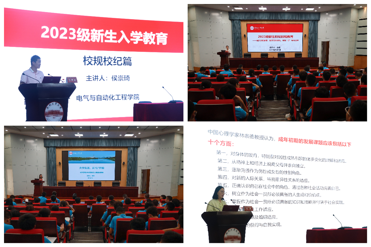 精神韫钰教育第一课。学院组织开展“弘扬青春力量,争做时代新人”“传·校园里的新文化”“续·校史里的新故事”等专题活动,旨在帮助新生认识大学、了解环境,发掘自身的优势,培养集体责任感和专业认同感。在“弘扬青春力量,争做时代新人”理想信念教育第一课报告中,学院党委副书记兼纪委书记李丽鹏围绕透视青年大学生不愿奋斗的表象、探寻矢志奋斗的意义和揭秘不懈奋斗的“密码”三个篇章展开,为新生带来一堂有严有趣,解困解惑深刻而又生动的课堂。在“解·校园里的新文化”校园文化教育第一课专题报告会中,2023级辅导员吴泽城就新生普遍关注的泛性切入点展开,从环境适应、自我认知、心态调节、能力塑造等多个角度回应了新生在大学生活中可能遇到的机遇和挑战,促进新生尽快将个人发展与学校培养、社会培养有机结合;在“续·校史里的新故事”校史校情教育第一课实践活动中,铺陈的老物件、典型的老故事、优秀的老前辈……伴随着文字图片、多媒体影像,学校的历史沿革生动地在新生面前铺开,在辅导员融专业特色的讲解下,学生纷纷表示这是一次学史之行,也是一次学知之行,要铭记校史馆里的旧荣光,续写青年学子、工大学子、电气学子的新故事。