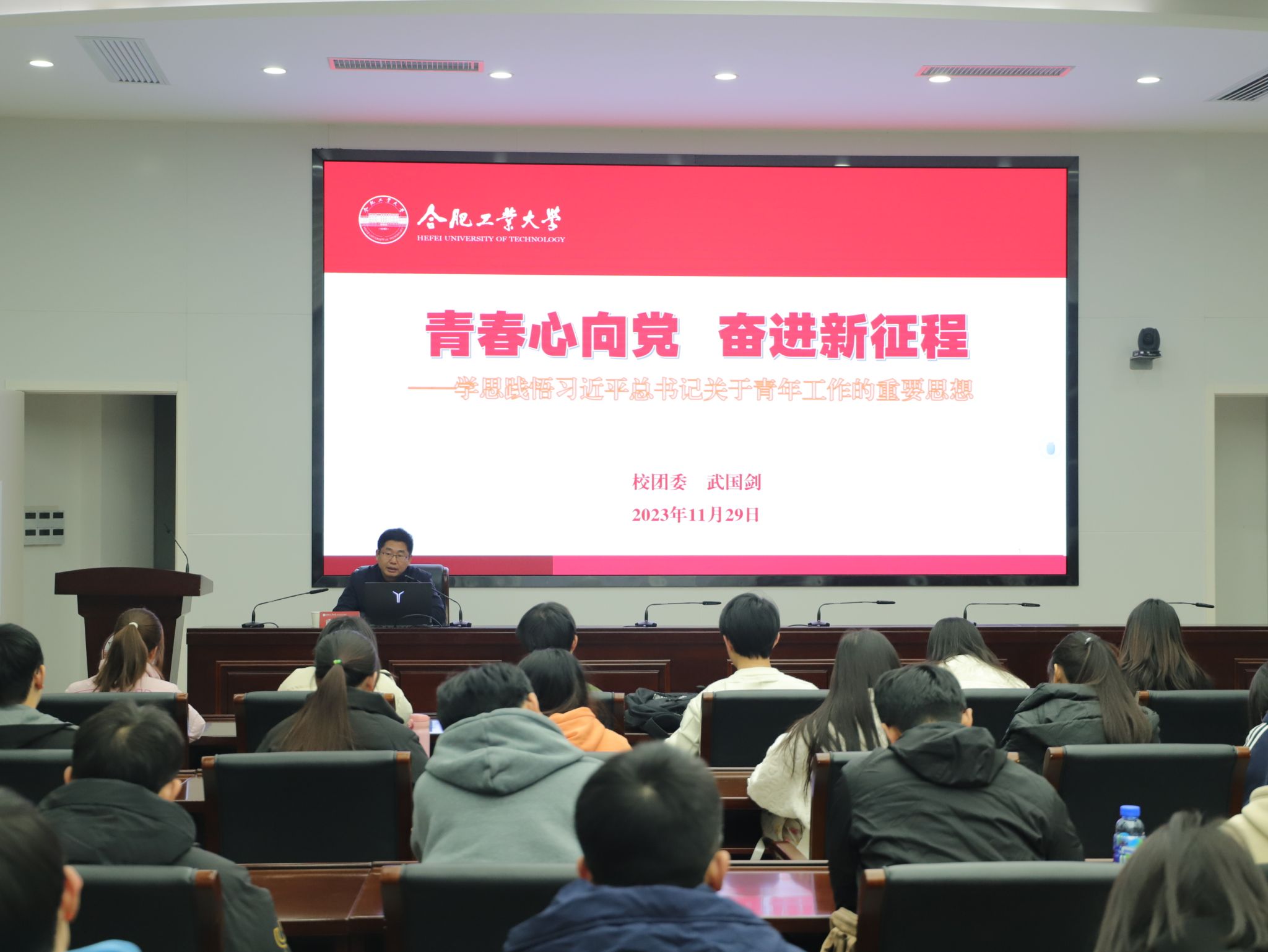 武国剑以“学思践悟习近平总书记关于青年工作的重要思想”为题,从深刻感悟习近平总书记对青年一代的高度重视和殷切关怀,深刻把握习近平总书记关于青年工作的重要思想和实践要求,自觉肩负起新时代赋予中国青年的时代责任与历史使命三方面介绍了如何把握习近平总书记关于青年工作的重要思想,提到“自中国共产党成立之日起,就始终把青年工作作为党的一项极为重要的工作”。随后,他介绍了习近平总书记在繁忙的治国理政过程中,始终高度重视和关怀青年,结合总书记给大学生的回信,带领同学们感悟总书记对青年一代的高度重视。指出,总书记十分重视青年工作,是因为中国的未来在青年一代身上,实现中华民族伟大复兴的接力棒始终要交给青年人,体现了总书记对青年一代的期待与忧虑。随后,解读了习近平总书记关于青年工作重要思想的“核心内容”,八个清晰指明,强调把青年一代培养造就成德智体美劳全面发展的社会主义建设者和接班人,要加强对广大青年的理想信念教育,坚定听党话跟党走的政治信念,在强国建设、民族复兴的历史潮流中确立正确的人生目标。强调,无论过去,现在还是未来,中国青年始终是实现中华民族伟大复兴的先锋力量,中国青年生逢其时,生逢盛世,更应当厚植爱国情怀,自觉肩负起新时代赋予中国青年的责任与使命。最后,以习近平总书记矢志不渝,先后十次申请入党,七年知青岁月,为人民做实事等实例,激励同学们坚定理想信念,将祖国需要作为自己人生的目标,以撸起袖子加油干的奋斗者姿态,培养敢叫日月换新天的创新品质,有越是艰险越向前的斗争精神及甘为真理付韶光的奉献意识,把青春的力量体现在使命担当中,不断学习成才,回馈社会。青年时代是人生中最宝贵的时期,希望全体学员牢记习总书记教诲,认真学思践悟习近平总书记关于青年工作的重要思想,珍惜韶华,自立自强,与新时代双向塑造,同向奔赴,以青春之我托举中国式现代化,勇做强国建设、民族复兴伟业的排头兵和生力军,把光和热洒满大地。