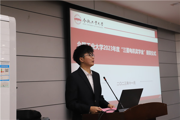 “三菱电机奖学金”获奖学生代表邵帅在发言中代表全体获奖同学,向辛勤培育学生的母校和老师表示最诚挚的感谢,并号召同学们坚守本色,不断奋斗,用拼搏的汗水浇灌理想的信念之花,心怀感恩,续力传承,用生动实践照亮技术之光,以青春之名赴时代之约,以赤子之情融民族伟业。
