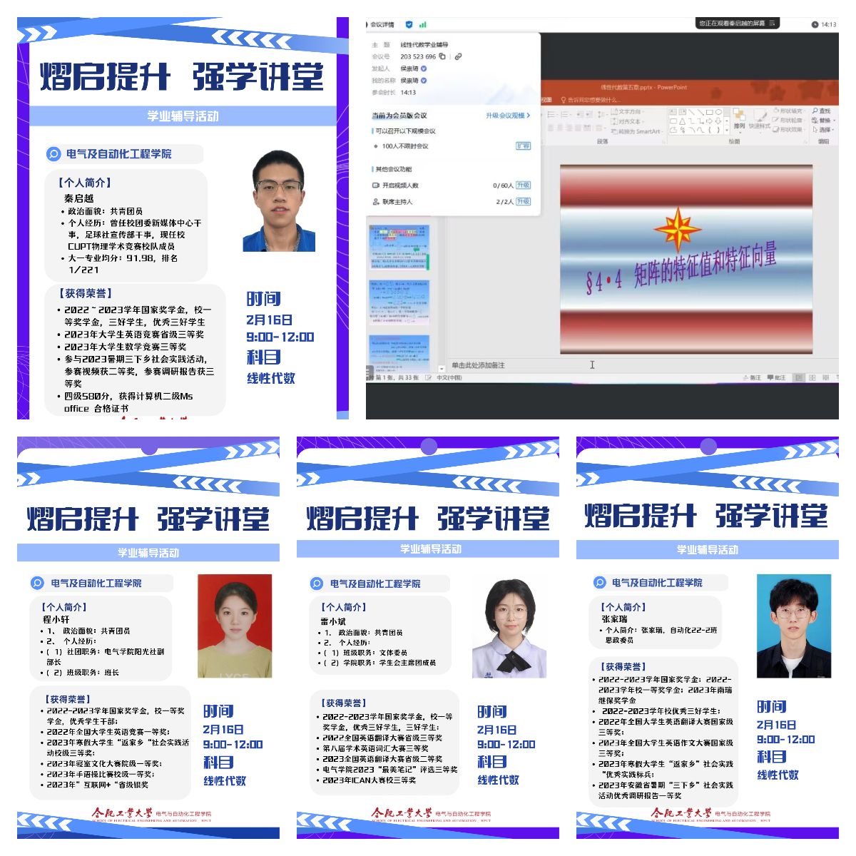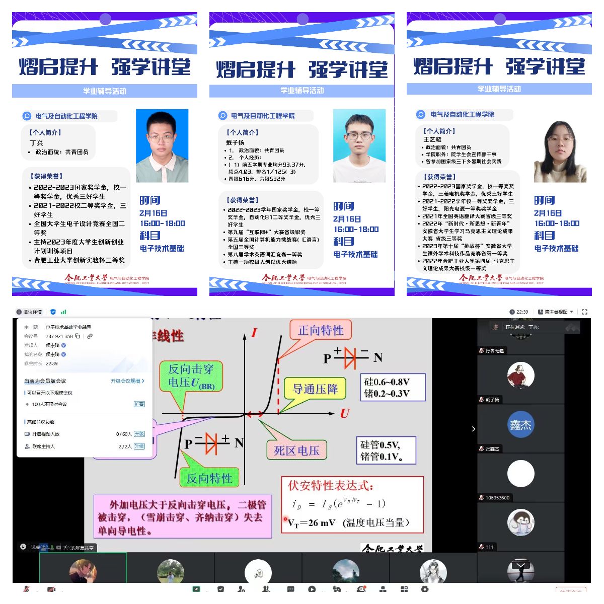 2月16日至2月18日,必赢线路检测3003no1开展“‘熠’启提升,强学讲堂”线上学业辅导活动,学院建立“骨干教师+朋辈讲师”学业导师队伍,各年级调研摸排学生需求,针对《电力电子技术》,《电子技术基础》,《线性代数》,《工程图学》等课程开展学业辅导,帮助学生掌握学习方法,把握重点难点,增添学习动能,树立学业信心,顺利通过考试,学院150余名学生参加活动。