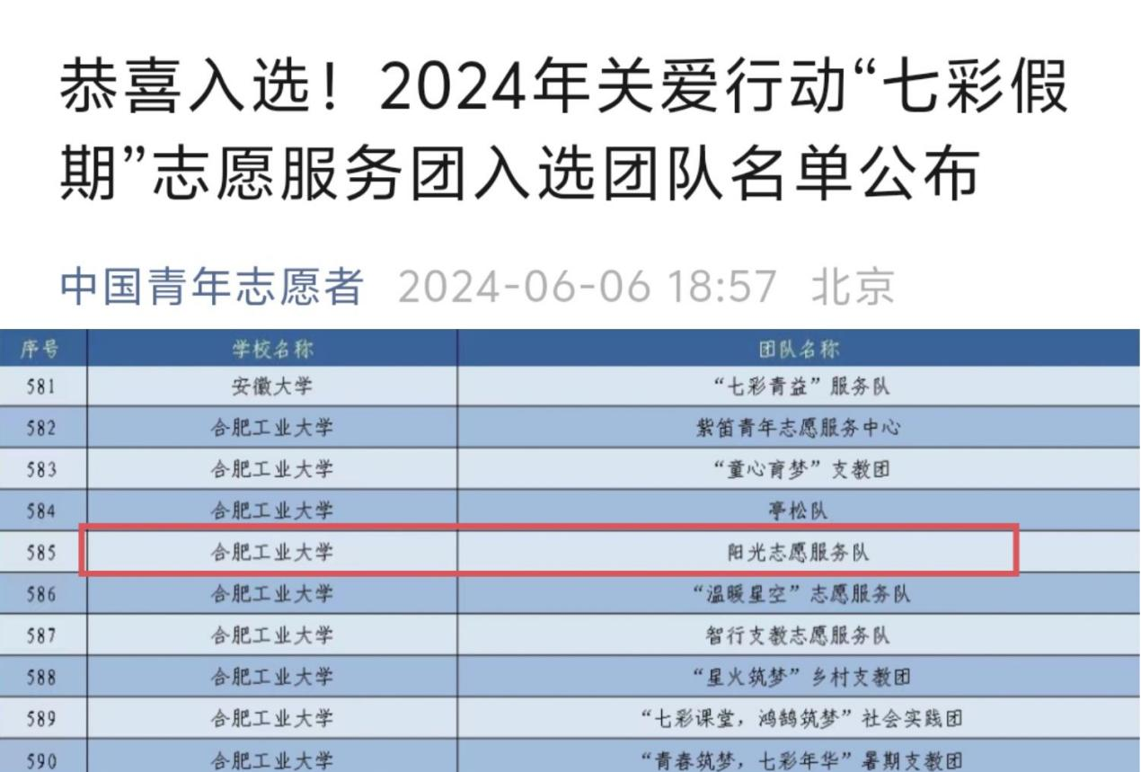 6月6日,共青团中央青年志愿者行动指导中心、中国青年志愿者协会秘书处发布了《关于遴选2024年关爱行动“七彩假期”志愿服务团的公告》我院“阳光志愿服务队”成功入选。