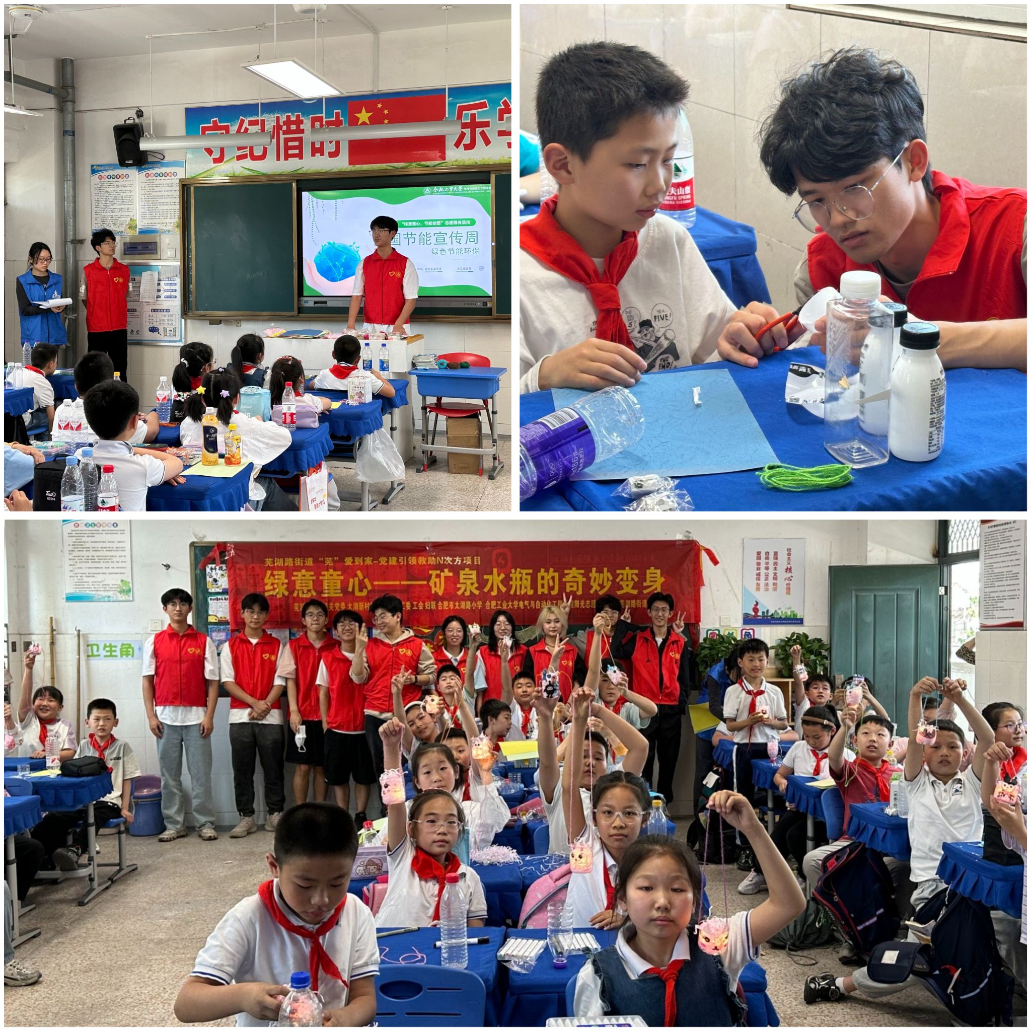 在合肥市太湖路小学,学员结合案例向小学生们讲述了“绿色”“节能”“环保”“双碳”的重要意义。围绕日常生活中一次性物品的使用场所,倡导大家树立绿色、低碳、环保的生活理念,少用、不用一次性塑料制品。在学员的指引下,学生们动手制作简易“节能灯”,将理论知识与实践锻炼紧密结合。机器人工程2023级2班佘文浩感叹:“一盏盏色彩斑斓‘小节能灯’照亮的不仅是孩子们的笑脸,更是节能减排的未来之路!”