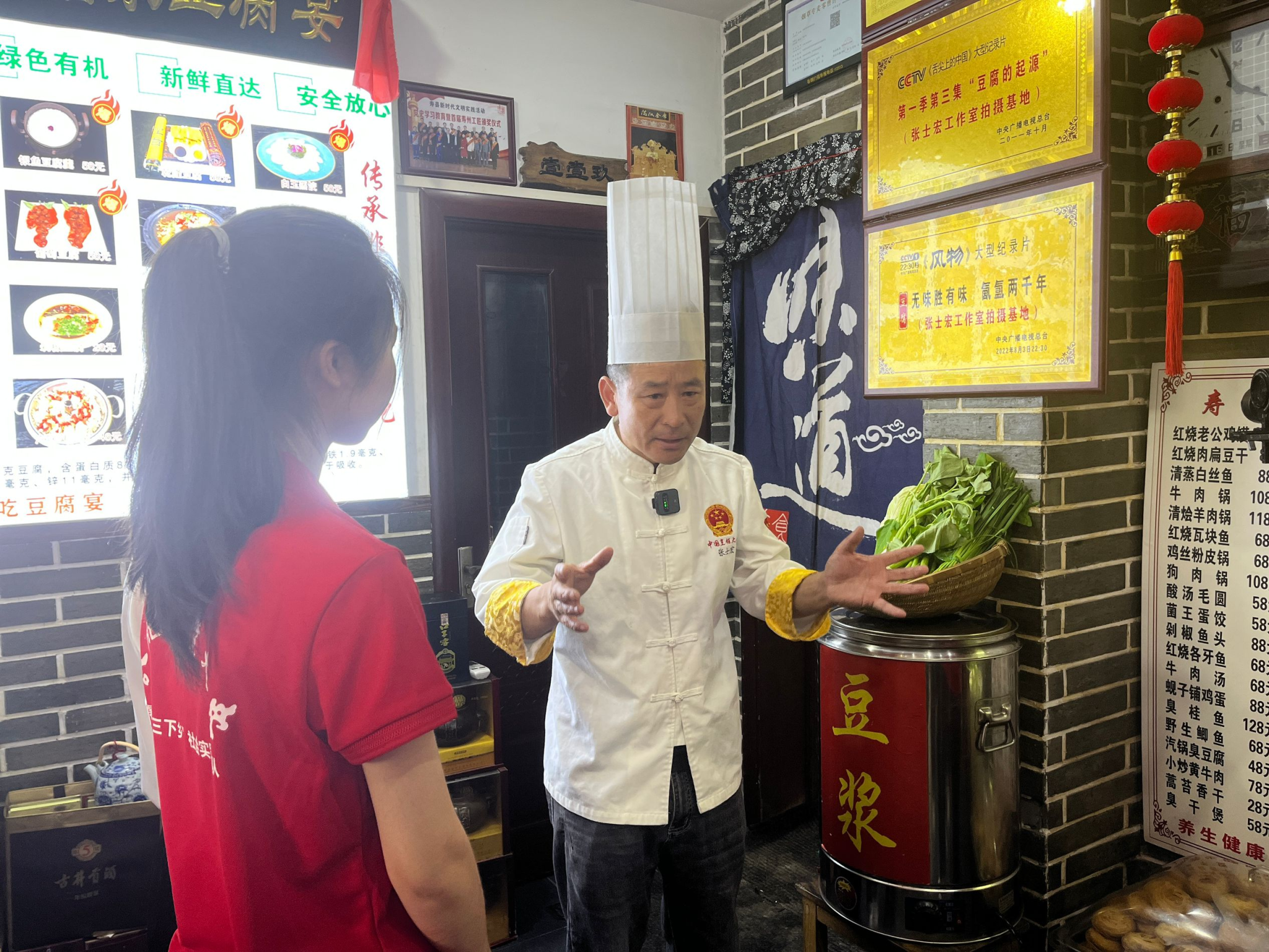 团队还采访了非遗豆腐宴传承人张士宏,并现场观赏学习豆腐宴的制作。张师傅做了近四十年的豆腐宴,在此期间独创了一百多道豆腐菜品,先后被央视新闻、江淮日报等媒体报道,其中“刘安点丹”、“淝水之战”和“楚鼎生香”等历史事迹,纷纷被他用豆腐菜的形式呈现出来,创新性地将非遗豆腐宴与寿县文化相结合,在传承豆腐宴的同时,助推了当地旅游业的发展。“我只是一个普通的农户,既然肩负了传承非遗的重任,就要想尽一切办法把豆腐宴做好、做精。”张士宏坚定地说,“要对得起自己的良心,对得起顾客的期望,对得起国家的支持”。成员们听了张师傅的话,敬佩之意油然而生。