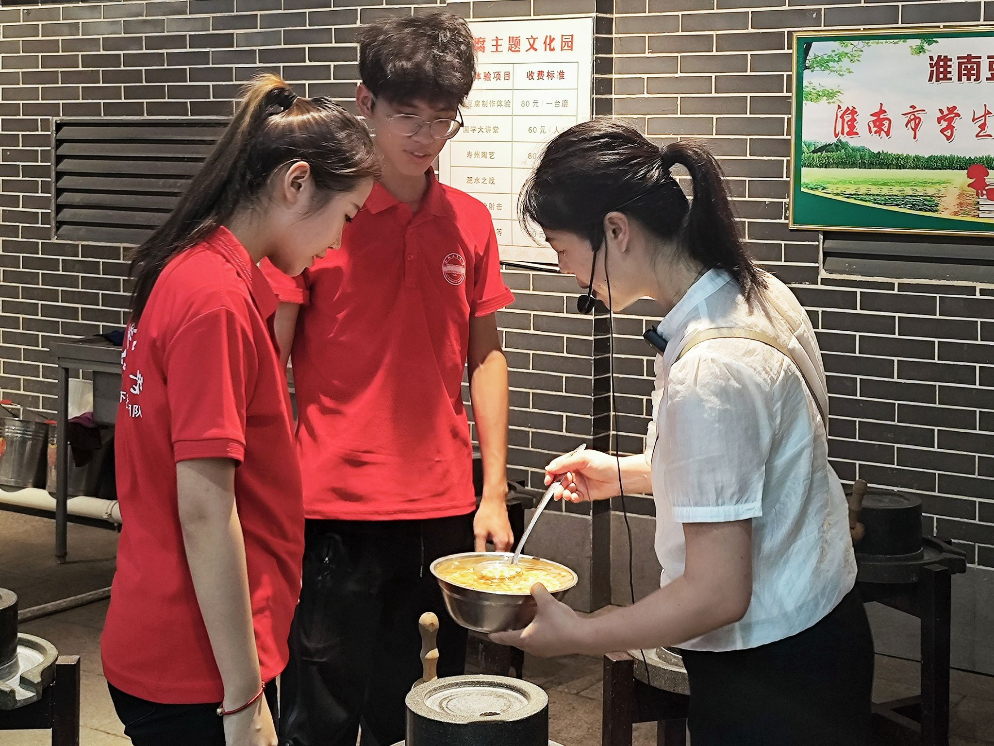团队首先抵达淮南寿县豆腐文化园进行参观,并体验豆腐制作过程。“豆腐之术,始于淮南王刘安。”团队踏入文化园内部,一座刘安铜像赫然在目,其后的豆腐模型彰显出豆腐始祖的身份。展厅通过时间线的方式,图文并茂地展示了豆腐制作的发展史。文化园通过画作和泥塑两种艺术形式,将豆腐制作过程具像化,让团队成员不知不觉放慢了脚步,静心去欣赏、感受这些精美工艺带来的视觉体验。随后,团队成员在讲解员的带领下进行豆腐制作。“豆腐园旨在通过让游客亲身体验豆腐制作的独特过程,激发他们深入了解淮南豆腐文化的兴趣,从而吸引更多人群沉浸于传统工艺的魅力之中。”讲解员杨静介绍道。
