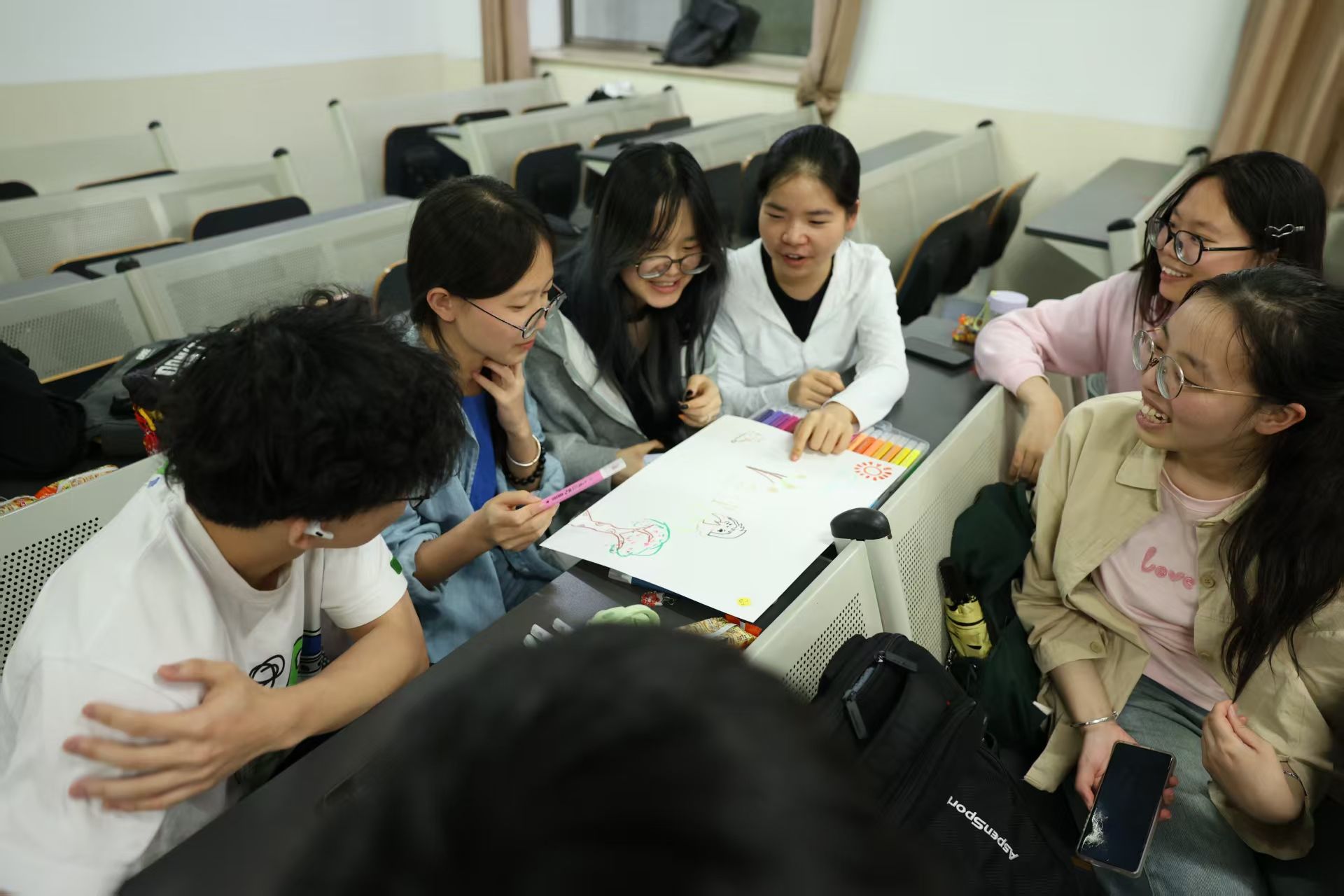 活动中,团支部书记首先带领全体同学回顾学校发展变迁的历史、取得的杰出成就以及众多杰出校友的事迹,引导学生以“爱国”为前提,以“爱校”为基础,弘扬爱国情怀,践行爱校意识。接着在“彩笔共绘工大情”的环节,同学们结合工大校门、校史馆、斛兵塘等元素进行创作,以共绘工大的方式表达爱校情怀。在创作过程中,同学们相互交换心得,分享绘画技巧,现场气氛热烈而温馨,每一笔都蕴含着对学校的深情厚谊,每一抹色彩都饱含着对学校的爱与祝福。