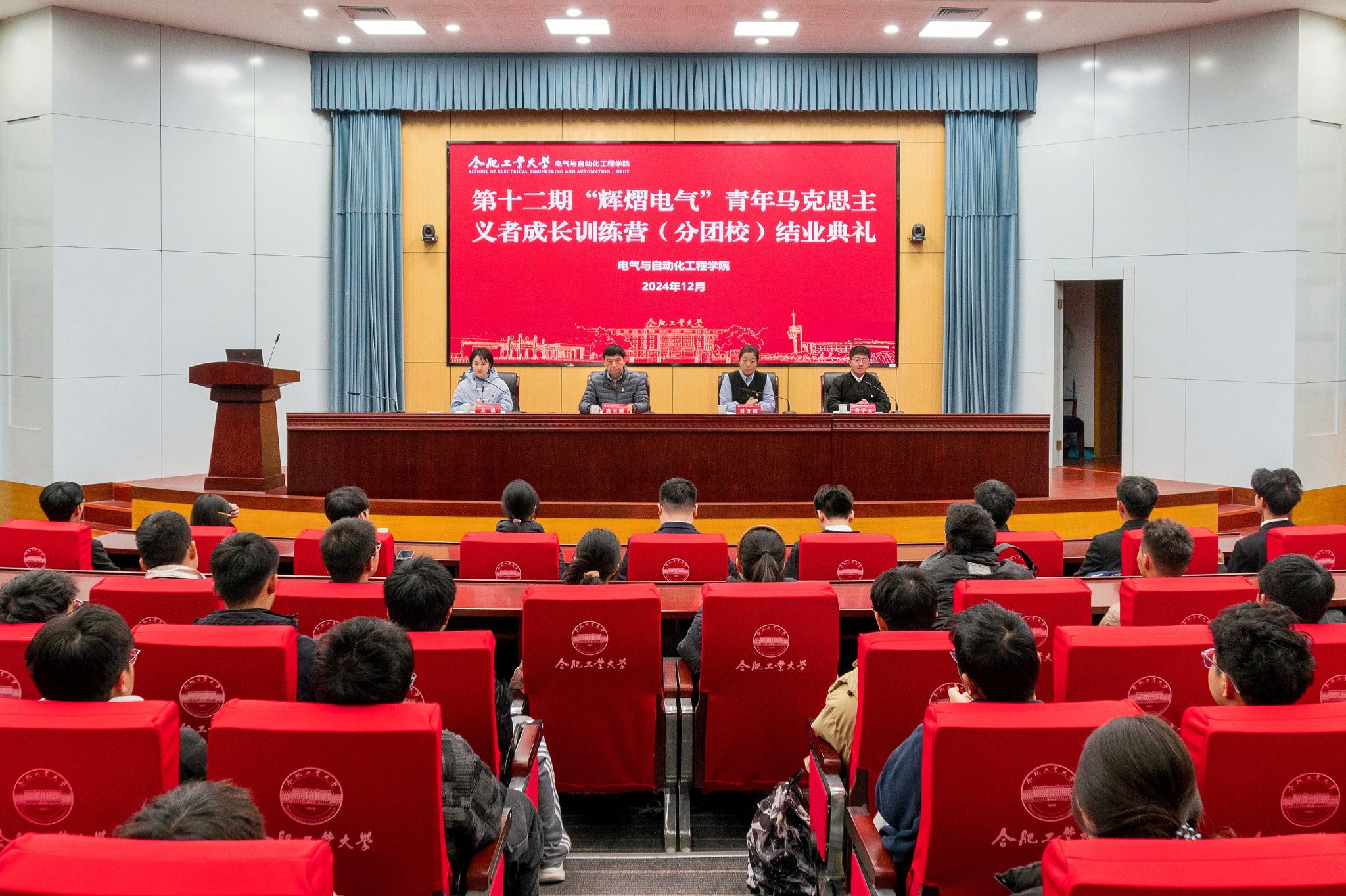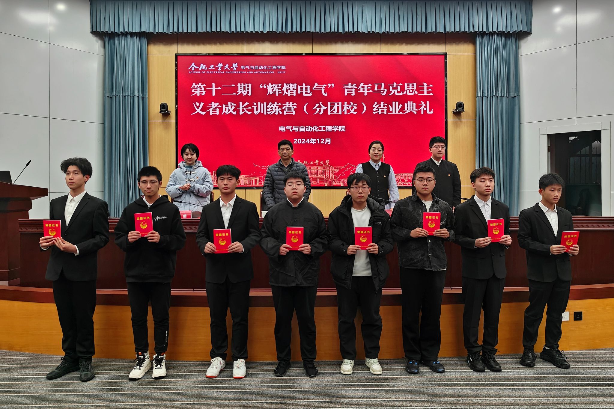 12月8日晚,必赢线路检测3003no1第十二期“辉熠电气”青年马克思主义者成长训练营(分团校)结业典礼在学术会议中心一楼大报告厅举行。学院副处级组织员施大顺、学工办主任兼团委书记刘开阳、学工办副主任兼团委副书记左能、分团校班主任及全体学员参加典礼。