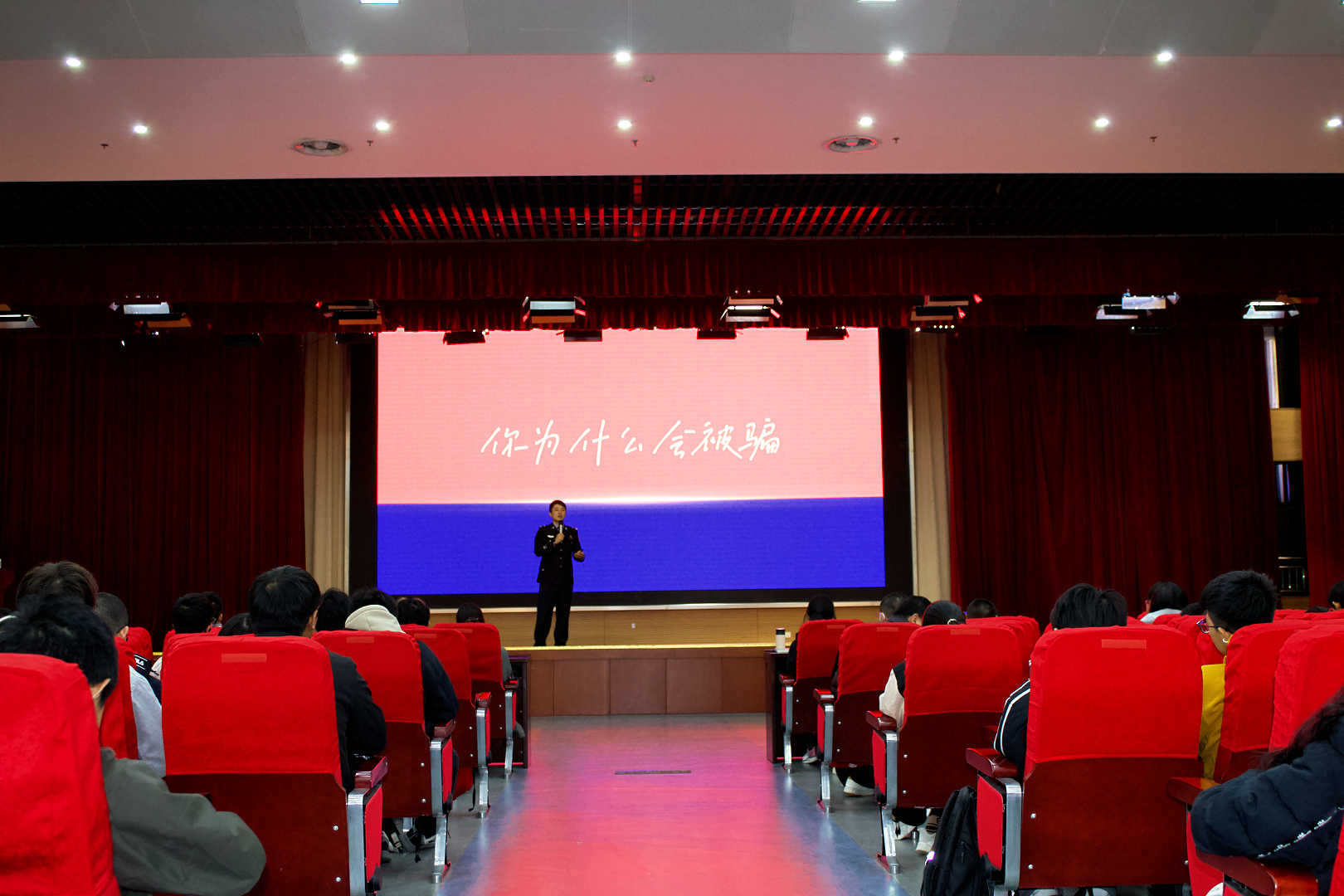 11月18日晚,必赢线路检测3003no1于翡翠湖校区科教楼二楼报告厅举办防范电信网络诈骗专题宣传讲座,全体2025级本科新生参会。