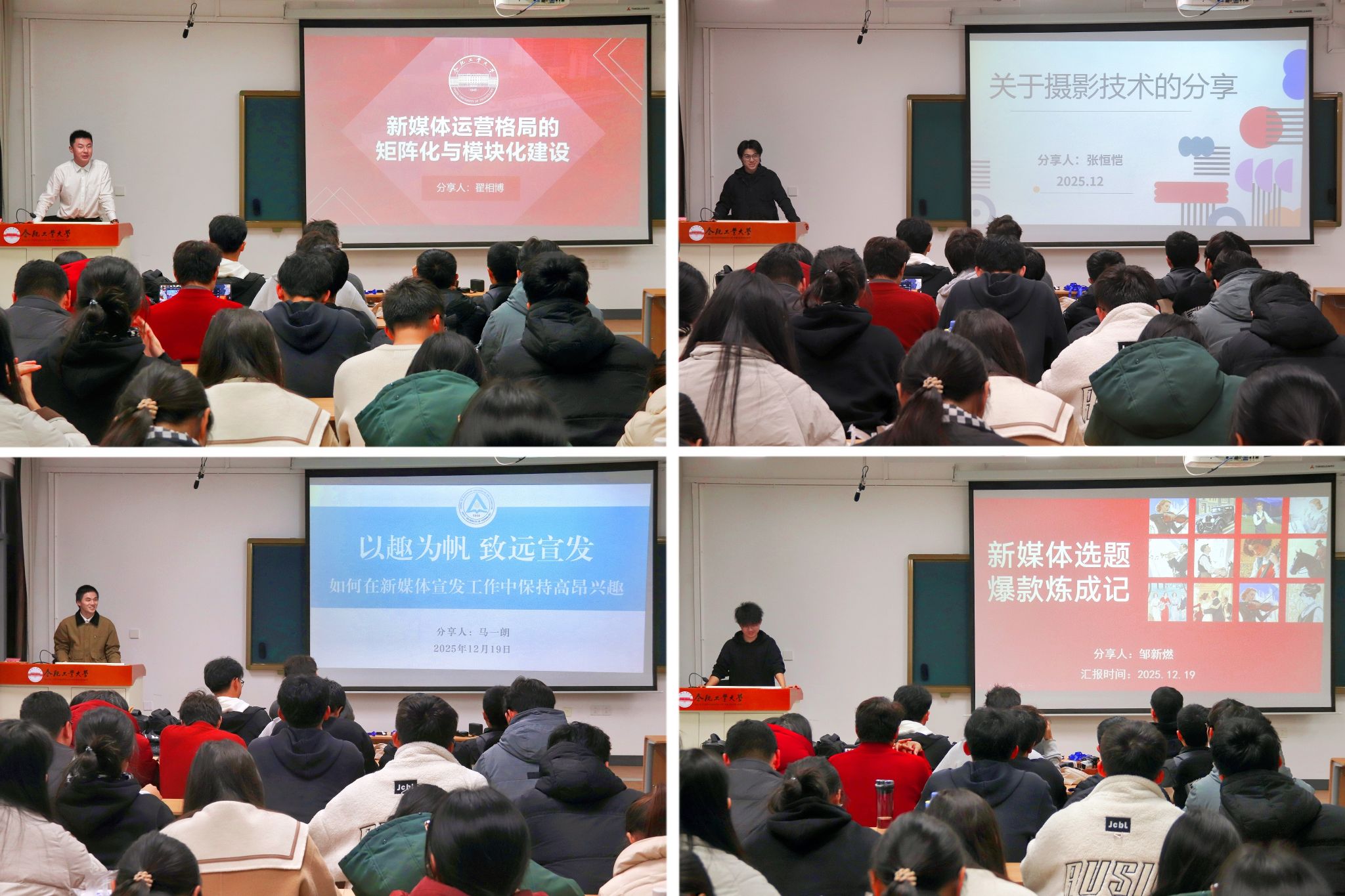 校全媒体中心翟相博同学围绕图、文、声、视四种传播路径,分享了优秀宣传载体的打磨技巧,并对新媒体运营格局的矩阵化与模块化建设提出思考见解。校团委新媒体中心张恒恺同学从相机使用要领、曝光基础元素、构图实例分析等方面,结合自身丰富的影像创作经验,详细分享了摄影摄像技巧。明理苑网络文化工作室马一朗同学以“致远宣发,以趣为帆”为主题,阐述了在新媒体工作中保持兴趣、心怀热情、团结协作的重要意义。学院新媒体中心往届主任邹新燃同学回顾了任职期间的工作经历,并以“选题爆款练成记”为题,讲述了选题思路拆解、文风审美进阶、热点线索捕捉等内容。