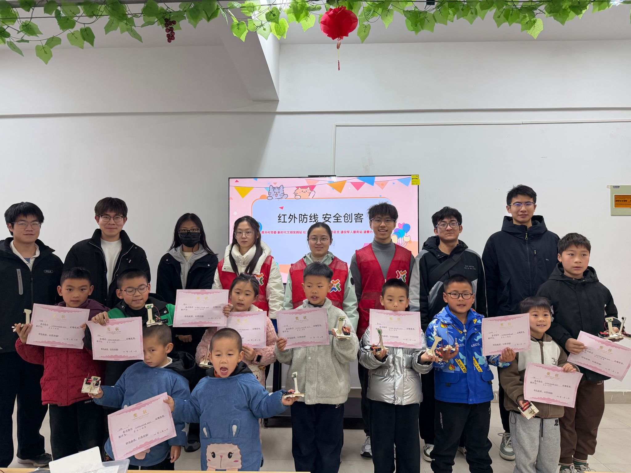 动手实践探索,体验科技魅力。志愿者带领孩子们分组制作“简易红外线报警器”。在耐心指导与协助下,孩子们协作连接电路板、安装红外发射与接收模块、调试蜂鸣器。当亲手制作的报警器在红外线被遮挡时成功报警,孩子们脸上洋溢着满满的喜悦与自豪。