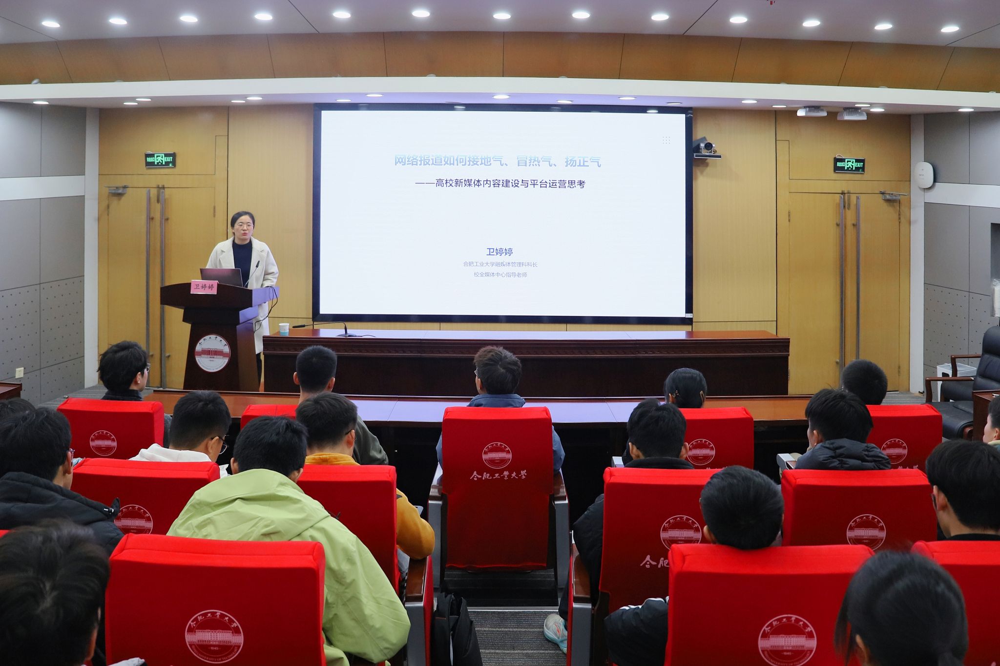党委宣传部融媒体管理科科长、校全媒体中心指导教师卫婷婷以《网络报道如何接地气、冒热气、扬正气?》为题展开讲授,她阐明校院两级媒体组织协同联动的重要意义,介绍了高校融媒体矩阵化运营的基本模式,分析了校园热点题材与线索捕捉的有效举措,并通过招生就业人物故事、工大二十四节气、电气领域杰出校友等案例,分享了学院新媒体特色品牌打造、学生骨干梯队培养、平台传播力影响力提升的思路方法。