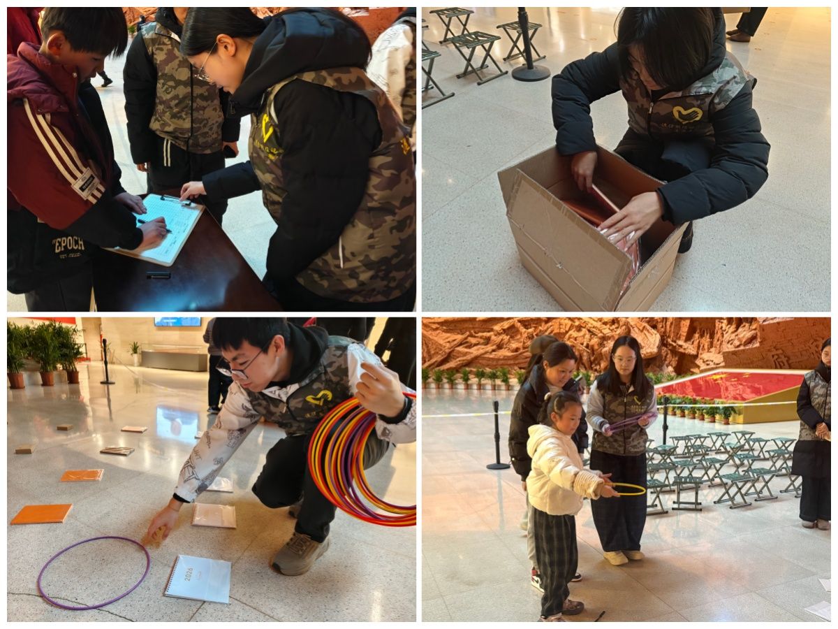 活动前期,阳光志愿服务中心志愿者提前与纪念馆工作人员对接,将台灯、新年台历等物资摆放至指定位置,开展报名签到、物资分发等工作,为活动顺利开展筑牢基础。活动现场,志愿者引导孩子们有序列队完成展板内容撰写,经审核通过后,分发套圈并细致讲解游戏规则。套圈区域内,志愿者调整投掷距离、贴心递圈并给予孩子们鼓励,参与者成功套中后及时帮忙拾取奖品。活动期间,志愿者定时检查补充套圈及奖品,同步整理活动区域,保障现场整洁有序,让大家在欢乐互动中收获满满。