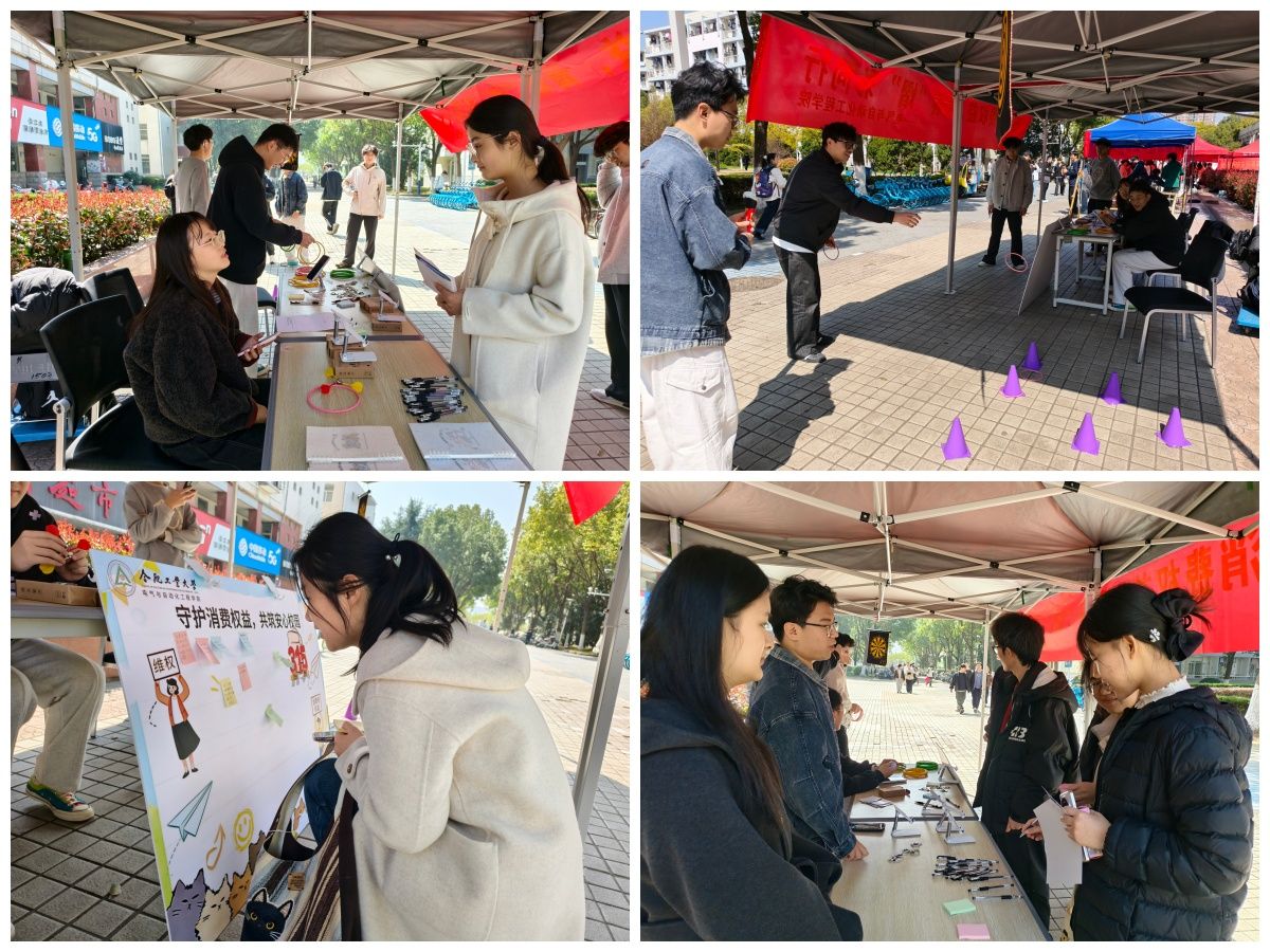 本次活动紧贴校园消费实际,聚焦网购纠纷、兼职诈骗、虚假宣传等常见问题,设置了展板宣传、互动留言、趣味体验和现场咨询四个区域。展板区通过典型案例解析常见消费陷阱;留言区鼓励同学们写下消费困惑与理性消费倡议,形成主题展示墙;互动区将维权知识融入套圈、飞镖等趣味游戏中,吸引同学们积极参与;咨询区则由工作人员和学生骨干现场答疑,针对实际问题提供指导。活动现场氛围热烈,吸引了百余名师生参与,同学们在参与互动的过程中加深了对消费维权知识的理解,也进一步树立了理性消费、依法维权的意识。