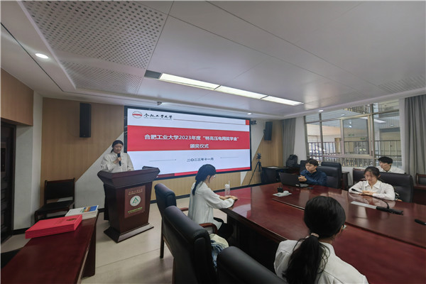 何岳颀宣读了《关于表彰第九届特高压电网奖学金获得者的决定》。与会领导嘉宾为获得本届奖学金的5位本科生颁发了荣誉证书。