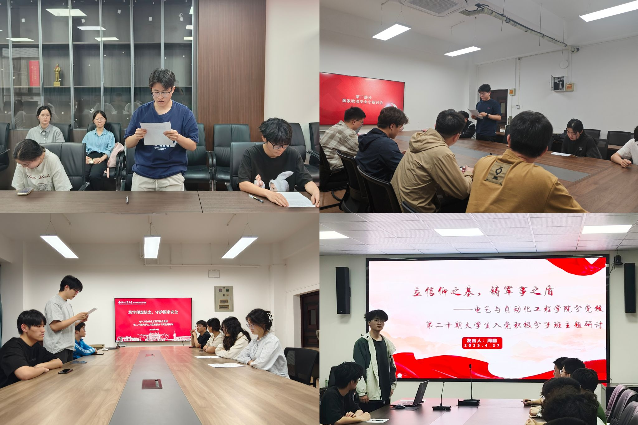 研究生代表徐炜超同学发言谈到,政治安全是总体国家安全观的“生命线”,作为新时代研究生,我们既是科技创新的主力军,更是捍卫国家政治安全的先锋力量。要在科研中严守数据安全、警惕技术泄露,立足学科前沿,聚焦国家战略需求,突破“卡脖子”难题,以科技硬实力筑牢国家安全防线。2023级本科生李晨同学发言谈到,当今世界,军事安全面临的风险挑战隐蔽复杂。作为青年大学生入党积极分子,我们应筑牢信仰之基,从党史中汲取“苟利国家生死以”的精神力量,将个人理想熔铸于民族复兴伟业。